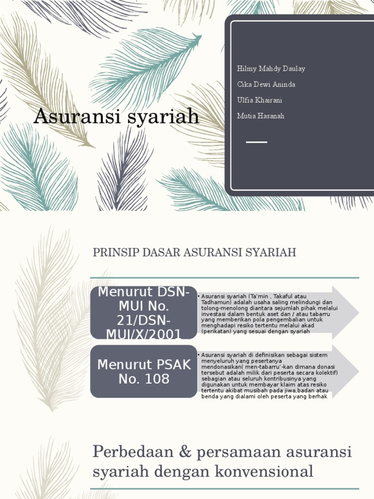 Dengan tingginya minat masyarakat terhadap lembaga keuangan syariah belakangan sudah mulai berkembang perusahaan asuransi yang. Perbedaan yang paling mendasar antara asuransi syariah dengan asuransi kovensional adalah pada keberadaan pengawasan dewan syariah (pds), akad, investasi dana, kepemilikan dana, pembayaran. 4499/lk/2000 tentang jenis, penilaian dan pembatasan investasi perusahaan asuransi dan perusahaan reasuransi dengan sistem syariah.