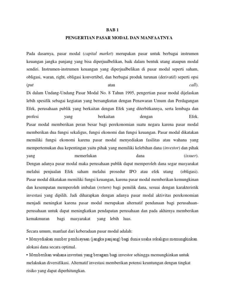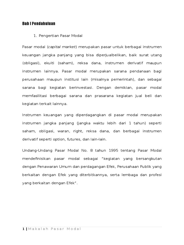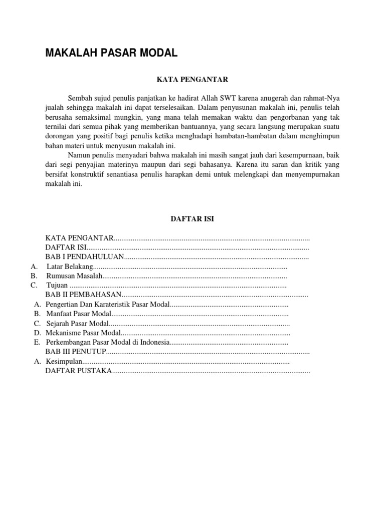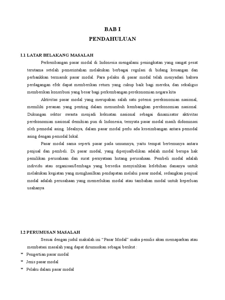 25 sma santo paulus pontianak tahun ajaran 2014/2015 bab i pendahuluan i.1 latar belakang masalah perkembangan pasar modal di indonesia mengalami peningkatan yang sangat pesat terutama setelah pemerintahan melakukan berbagai regulasi di bidang keuangan dan perbankkan termasuk pasar modal. Makalah pasar modal kata pengantar. Dalam pengelolaan pasar modal, sebelum dapat melakukan transaksi, terlebih dahulu investor harus menjadi nasabah di perusahaan efek atau broker saham.