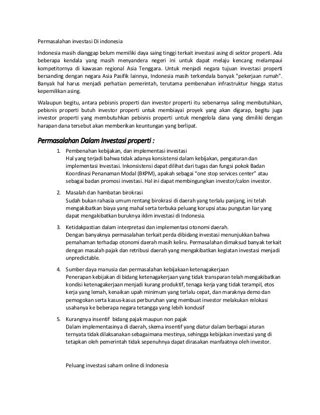 Investor indonesia tidak sabaran via korkedbats.com terakhir, pemikiran masyarakat indonesia yang belum mengarah pada kedewasaan atau drive to maturity.sifat seperti serakah dan tidak sabar membuat masyarakat sering kali menempatkan dirinya pada posisi yang salah dengan memilih investasi yang. Pertumbuhan masih mengandalkan investasi dan konsumsi sehingga iklim usaha harus dijaga. Lembong di batam, kepulauan riau, jumat (3.4.2017) , menjelaskan, kendala pertama adalah banyak peraturan yang menghambat datangnya penanam modal.